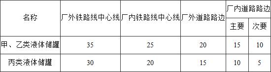 表4.2.9甲、乙、丙類(lèi)液體儲(chǔ)罐與鐵路、道路的防火間距(m)