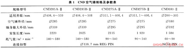 鑒于空氣錘獨(dú)特的技術(shù)優(yōu)勢(shì)[1~2],中原油田鉆井工程技術(shù)研究院開(kāi)展了CND型空氣錘的研制,具有結(jié)構(gòu)簡(jiǎn)單、故障率低、可靠性高、技術(shù)支持及時(shí)等特點(diǎn),主要技術(shù)性能指標(biāo)處于國(guó)內(nèi)領(lǐng)先水平。已完成285A、285B、275A、275B、Φ180mm3種型號(hào)5種規(guī)格空氣錘設(shè)計(jì)、研制。配套加工Φ444.5mm、Φ406.4mm、Φ320mm、Φ314.3mm、Φ311.1mm、Φ241.3mm、Φ215.9mm7種規(guī)格空氣錘鉆頭。開(kāi)發(fā)研制了多種形式鉆頭防掉落安全機(jī)構(gòu),有效防止鉆頭斷裂入井。獨(dú)創(chuàng)設(shè)計(jì)了兩種鉆頭保徑齒結(jié)構(gòu)形式,有效降低了鉆頭徑向磨損,提高鉆頭壽命。自主設(shè)計(jì)了空氣錘配套工具:高壓定量注油機(jī)和液壓鏈鉗[3]。