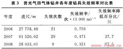 氣體鉆井施工中鉆具斷裂頻率遠(yuǎn)高于鉆井液鉆井。鉆具斷裂不僅部分抵消了氣體鉆井技術(shù)的提速效果,而且給井下安全帶來(lái)隱患。預(yù)防和減少鉆具斷裂,對(duì)于提高井下安全以及推廣應(yīng)用氣體鉆井技術(shù)具有重要意義。對(duì)多只斷裂鉆具進(jìn)行理化性能檢驗(yàn)、金相分析、掃描電鏡和能譜分析、腐蝕產(chǎn)物XRD分析發(fā)現(xiàn):失效鉆具的化學(xué)成分、金相組織等均符合相關(guān)標(biāo)準(zhǔn);僅個(gè)別鉆桿的屈服強(qiáng)度和縱向沖擊功不符合API Spec 5D標(biāo)準(zhǔn);鉆桿為疲勞或腐蝕疲勞斷裂;鉆鋌為典型的疲勞斷裂;鉆具腐蝕類型為氧腐蝕。氣體鉆井鉆具失效的主要原因是[4]:①氧腐蝕和沖蝕。氣體鉆井中,注入氣體中含有約20%的氧氣,若鉆進(jìn)井段地層出水或進(jìn)行霧化、泡沫鉆井時(shí),則極易發(fā)生氧腐蝕。②鉆柱反轉(zhuǎn)。鉆具質(zhì)量不平衡、鉆柱轉(zhuǎn)動(dòng)時(shí)產(chǎn)生的離心力以及鉆柱與井壁間的摩擦力是引起鉆柱反轉(zhuǎn)的三要素。反轉(zhuǎn)使鉆具承受高頻高幅交變彎曲應(yīng)力。當(dāng)鉆柱沿井壁作純滾動(dòng)時(shí),反轉(zhuǎn)速度最高。反轉(zhuǎn)運(yùn)動(dòng)對(duì)鉆具失效有嚴(yán)重影響。氣體鉆井中,鉆柱與井壁間幾乎為干摩擦,因而更容易產(chǎn)生反轉(zhuǎn)運(yùn)動(dòng),這是氣體鉆井比鉆井液鉆井鉆具失效頻率高的原因之一。牙輪鉆頭鉆井所用轉(zhuǎn)盤轉(zhuǎn)速(一般為50~80r/min)比空氣錘鉆井所用轉(zhuǎn)速(一般為15~30r/min)高。因此,牙輪鉆頭鉆井中鉆柱反轉(zhuǎn)運(yùn)動(dòng)更劇烈,這是牙輪鉆頭鉆井遠(yuǎn)比空氣錘鉆井鉆具失效頻率高的原因之一。③鉆柱縱向振動(dòng)。鉆柱振動(dòng)是導(dǎo)致鉆柱疲勞破壞的主要因素,主要包括橫向振動(dòng)、扭轉(zhuǎn)振動(dòng)和縱向振動(dòng),在直井中以縱向振動(dòng)為主。牙輪鉆頭鉆硬地層時(shí)會(huì)引起兩種頻率的縱向振動(dòng):因鉆頭輪齒滾動(dòng)而產(chǎn)生的高頻小位移縱振和因波狀井底引起的低頻大位移縱振。前者對(duì)碎巖有利,而后者對(duì)鉆具壽命影響很大。造成牙輪鉆井鉆具失效頻率高。④井眼彎曲。當(dāng)井斜較大,存在嚴(yán)重狗腿,鉆桿在彎斜井段旋轉(zhuǎn)時(shí),承受交變彎曲應(yīng)力,且狗腿以上井段鉆具斷裂次數(shù)少,狗腿以下井段鉆具斷裂次數(shù)明顯增多。⑤鉆鋌螺紋連接彎曲強(qiáng)度比不足。按照API標(biāo)準(zhǔn),Φ203.2mm、Φ228.6mm鉆鋌應(yīng)分別采用NC56、NC61螺紋,但普光氣田所用的同規(guī)格鉆鋌分別使用Φ168.3mm REG、Φ193.7mm REG螺紋,其BSR遠(yuǎn)低于NC56、NC61螺紋?,F(xiàn)場(chǎng)所用鉆鋌螺紋連接彎曲強(qiáng)度比低和牙根應(yīng)力集中程度高,是鉆鋌多在母扣根部而非公扣處斷裂的主要原因。⑥缺乏探傷和精細(xì)管理,鉆具的使用時(shí)間可能超過(guò)了疲勞壽命。提出了氣體鉆井預(yù)防鉆具失效措施,主要包括空氣錘沖旋鉆井技術(shù)、優(yōu)化參數(shù)鉆柱防共振技術(shù)、加強(qiáng)鉆鋌螺紋探傷及選用高質(zhì)量鉆具等。這些技術(shù)的應(yīng)用取得了明顯的效果。鉆具失效頻率逐年降低(表3)。