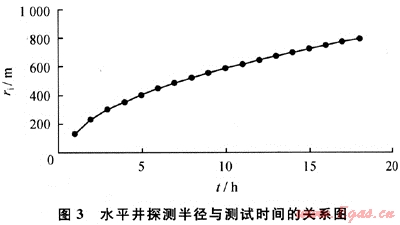 給定水平井段長(zhǎng)度為500m,氣層厚度為40m,水平滲透率為0.005μm2,各向異性系數(shù)為2,氣體黏度為0.04mPa·s,孔隙度為10%,綜合壓縮系數(shù)為0.0005MPa-1,測(cè)試時(shí)間1~18h。由式(8)得出探測(cè)半徑與測(cè)試時(shí)間的關(guān)系如圖3所示。從圖3可以看出,探測(cè)半徑隨時(shí)間延長(zhǎng)上升幅度減小,呈現(xiàn)非線(xiàn)性特征。