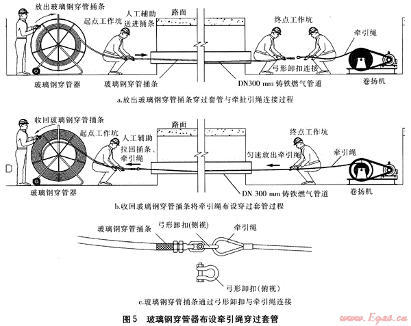 以下介紹以卷揚機作為機械牽引動力、以廢舊的DN 300mm鑄鐵燃氣管道作為套管、以NOD 200mm的PE燃氣管道進行穿插套管的施工技術。