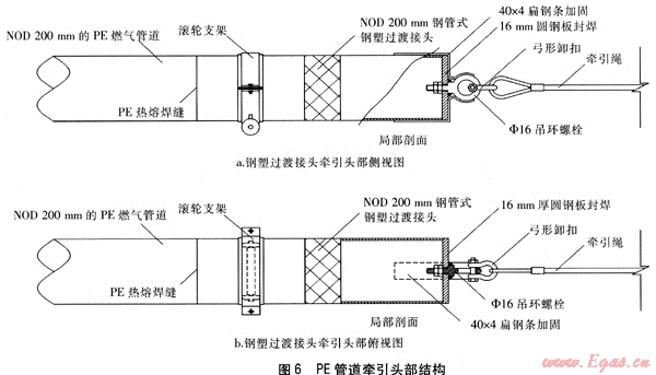 牽引頭部采用與PE管道相同規(guī)格的鋼塑過渡接頭制成,鋼塑過渡接頭的PE管端與NOD 20mm的PE管道熱熔焊接,DN 200mm鋼管端用厚度為16mm、直徑為219mm的圓形鋼蓋板滿焊封閉。鋼蓋板中心開有直徑為20mm的圓孔,事先穿入M16帶肩吊環(huán)螺栓1根(整體式鍛鋼材質(zhì)),鋼蓋板內(nèi)側用M16雙螺母緊固,吊環(huán)貼附于鋼蓋板外側。吊環(huán)圓孔內(nèi)、外徑分別為48、80mm,其底部與鋼蓋板通過焊接連為一體。吊環(huán)兩側各焊接1根規(guī)格為40×4的扁鋼條進行加固,扁鋼條從鋼蓋板表面延伸至鋼塑過渡接頭DN 200mm鋼管端側面,所有焊縫均為滿焊。