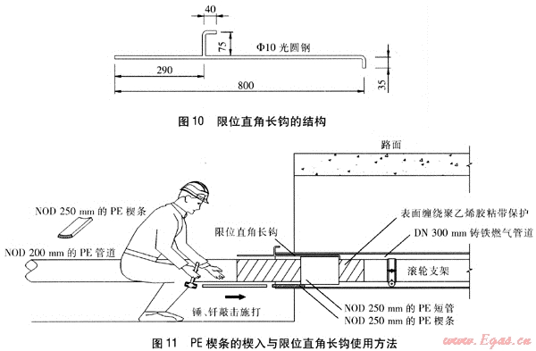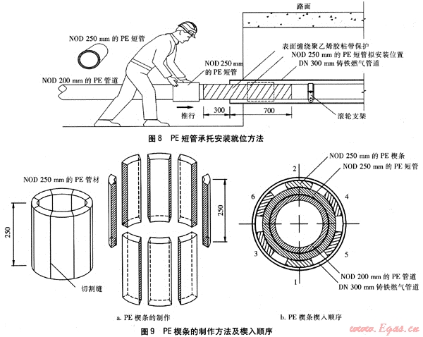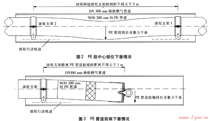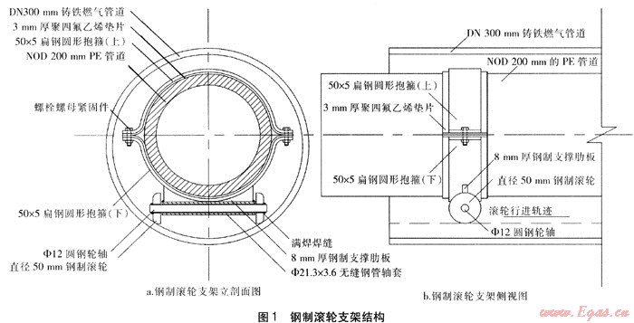 以某DN 300mm鑄鐵燃氣管道改造工程為例,詳細介紹了以廢舊的DN 300mm鑄鐵燃氣管道為套管,將公稱外徑200mm的PE燃氣管道采用鋼制滾輪支架穿插入套管的施工方法。