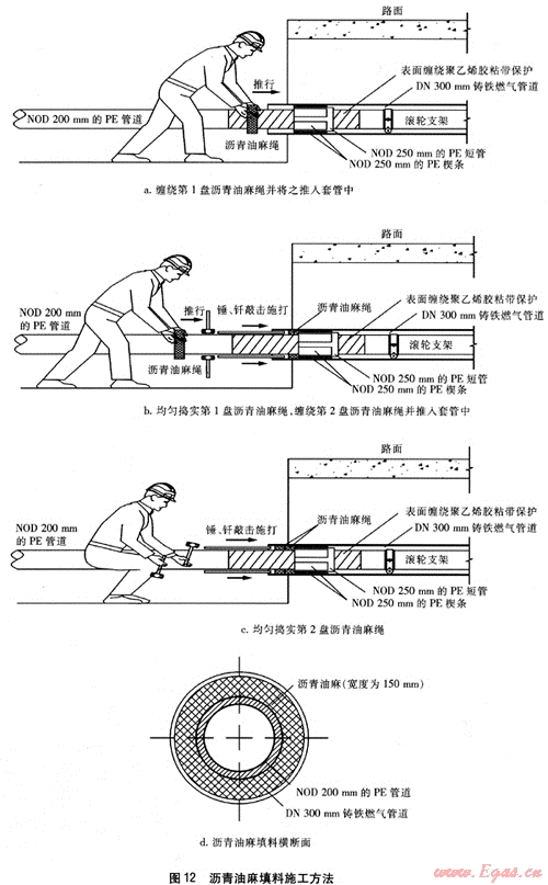 瀝青油麻填料一般分2次填塞,以確保其密實度,具體做法見圖12。將直徑為30mm的油麻繩用環(huán)氧煤瀝青漆浸泡15min后取出,均勻纏繞在NOD 200mm的PE燃氣管道上(PE管道表面事先纏繞1層聚乙烯膠粘帶保護,搭接寬度為膠粘帶寬度的50%,纏繞長度為1000mm),待形成寬度約80mm,外徑約300mm的盤狀繩圈后,將瀝青油麻繩推入套管內(nèi)的空隙內(nèi),用直徑為20mm、一端為光圓鈍頭的鋼筋釬棒均勻搗實瀝青油麻繩,并使之緊貼于NOD 250mm的PE短管承托的外側端面上。按同樣要求纏繞、搗實第2盤瀝青油麻繩,瀝青油麻填料的最終寬度為150mm。