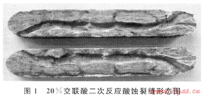 試驗(yàn)結(jié)果表明,20%膠凝酸鮮酸能得到一定的導(dǎo)流能力,10%膠凝酸(模擬殘酸)導(dǎo)流能力遠(yuǎn)遠(yuǎn)低于鮮酸,說明酸液進(jìn)入裂縫的深部刻蝕能力降低,試驗(yàn)3與試驗(yàn)1相比,說明閉合酸化能顯著提高裂縫導(dǎo)流能力。二次試驗(yàn)后平行板巖心的酸蝕溶孔道更為明顯,而且酸蝕孔道的深度更深,具有更高的導(dǎo)流能力(圖1)。說明采用高黏度的交聯(lián)酸,無需進(jìn)行閉合酸化和多級注入工藝就可以獲得高的導(dǎo)流能力,而且由于酸巖反應(yīng)慢,活性酸能進(jìn)入地層深部,是進(jìn)行碳酸鹽巖地層深部改造的理想酸液體系。