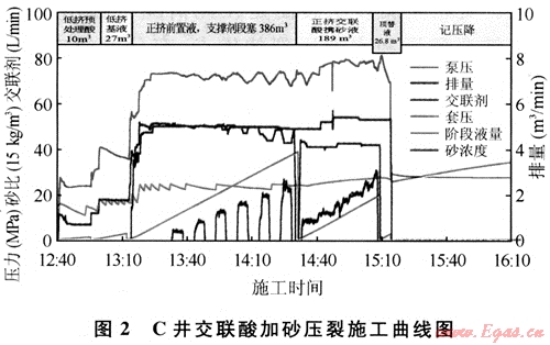 C井的交聯(lián)酸加砂壓裂是國內(nèi)外首次在井深超過5000m、溫度高于140℃地層中成功實(shí)現(xiàn)真正的交聯(lián)酸加砂施工,為碳酸鹽巖的儲層改造開拓了新的、更廣闊的途徑,在碳酸鹽巖改造工藝突破的歷史進(jìn)程中具有里程碑的意義。