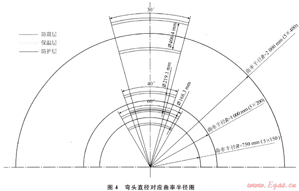 一般熱煨彎頭的曲率半徑為5DN,有時也為10DN,LG試采工程彎頭保溫部分工程熱煨彎彎頭的曲率半徑為5DN,彎頭保溫模具曲率半徑R保溫因此確定為5DN。彎頭直徑對應(yīng)曲率半徑如圖4所示。
