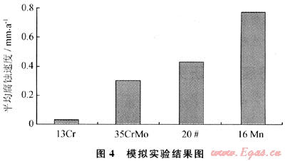 雅克拉氣田、大澇壩氣田管道材料為16Mn、20號鋼,材料耐蝕性能差。在模擬雅克拉氣田介質條件下,對20號鋼、16Mn等4種材料進行了實驗評價,實驗結果見圖4[7]。
