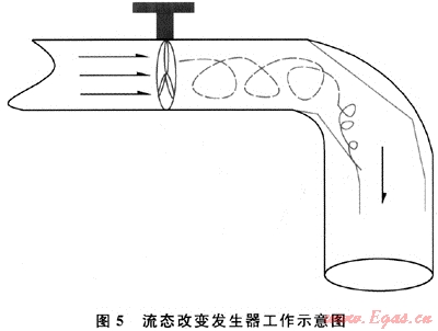 2) 可考慮在彎管前增加流體流態(tài)改變發(fā)生器。由圖2可知,在彎管內壁外側后段和內壁內側前段易形成湍流,產(chǎn)生空泡腐蝕。因此,可在流體進入彎管前增加一個流體流態(tài)改變裝置,預先給流體增加一個反向旋渦,避免在彎管處產(chǎn)生強烈的渦流,減緩腐蝕,工作原理見圖5。