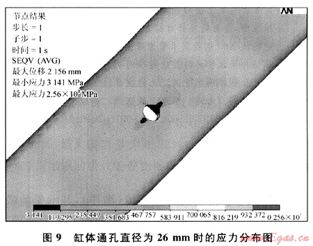 由表2可以看出,當(dāng)缸體通孔直徑為26mm時(shí),缸體最大應(yīng)力值小于材料許用應(yīng)力,缸體安全。此時(shí)的通孔應(yīng)力分布如圖9所示。