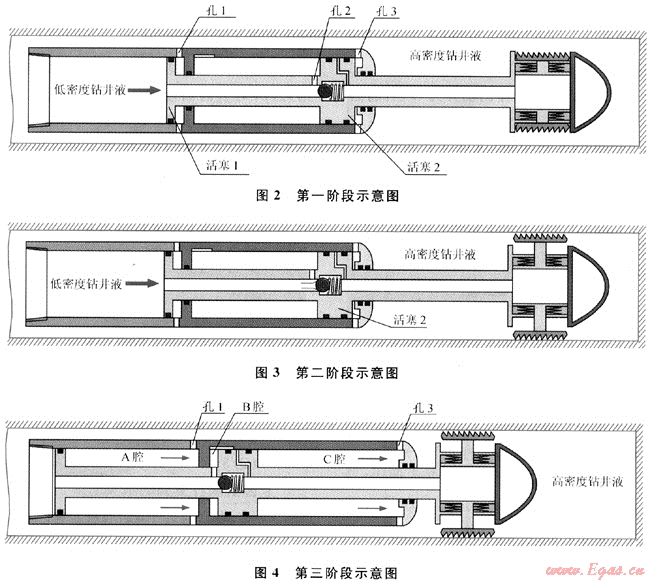 1) 對(duì)套管內(nèi)的低密度鉆井液加壓,活塞桿右行。如圖2所示,對(duì)套管內(nèi)的低密度鉆井液施壓,低密度鉆井液所產(chǎn)生的壓力和泵壓共同作用在活塞1的左側(cè)面上,同時(shí)通過(guò)活塞桿上的通道和孔2作用在活塞2的左側(cè)面上,共同產(chǎn)生向右的推力,克服高密度鉆井液作用在活塞1、2右側(cè)面上的阻力和密封摩擦阻力,推動(dòng)活塞和卡盤向右運(yùn)動(dòng)。