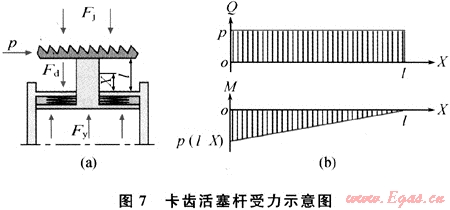 卡齒卡緊井壁時(shí),活塞桿的受力情況如圖7-a所示。