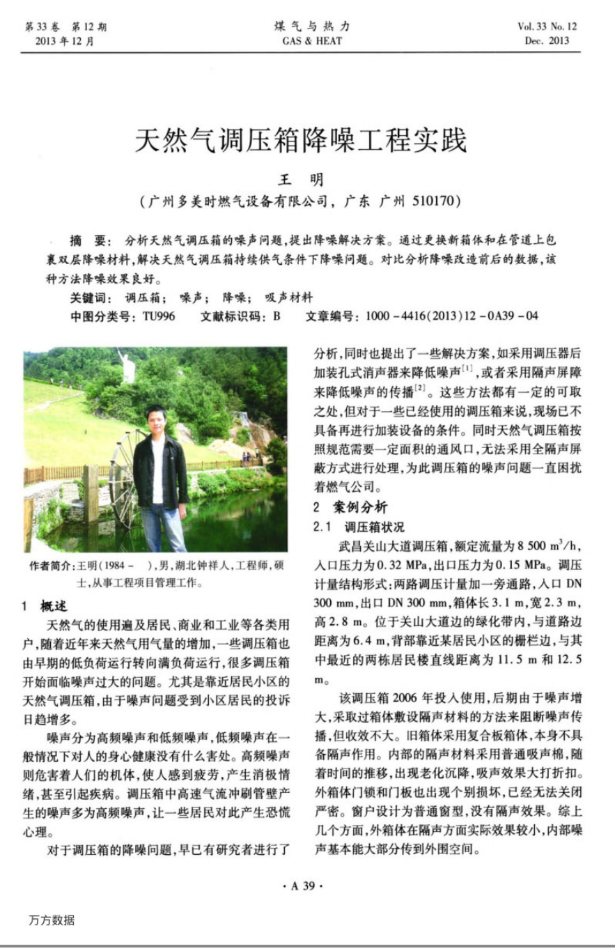 天然氣調壓箱降噪工程實踐:分析天然氣調壓箱的噪聲問題,提出降噪解決方案。通過更換新箱體和在管道上包裹雙層降噪材料,解決天然氣調壓箱持續(xù)供氣條件下降噪問題。對比分析降噪改造前后的數據,該種方法降噪效果良好。