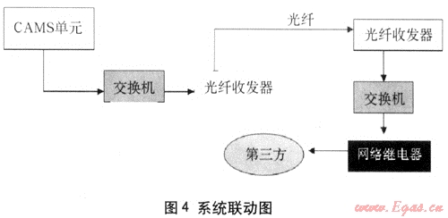 利用鋪設(shè)的備用光纖組建局域網(wǎng),通過交換機(jī)把5臺(tái)控制器接入,同時(shí)也將設(shè)置在“主調(diào)中心”內(nèi)部監(jiān)控中心的“CAMS單元”通過交換機(jī)接入整體系統(tǒng)來(lái)實(shí)現(xiàn)對(duì)前端5臺(tái)控制器的集中管理,利用CAMS單元的電子地圖功能來(lái)對(duì)防護(hù)目標(biāo)進(jìn)行實(shí)時(shí)監(jiān)控。“光纖收發(fā)器”和“網(wǎng)絡(luò)繼電器”以及“CAMS單元”來(lái)實(shí)現(xiàn)前端管道現(xiàn)場(chǎng)其它設(shè)備的聯(lián)動(dòng)(圖4)。