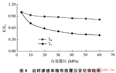 1是采用CMS300測得的低滲透巖石滲透率與有效覆壓關系曲線。從圖1可看出:①巖樣初始滲透率(K0越低,滲透率在有效覆壓增加的過程中的下降幅度越大;②滲透率在有效覆壓增大的初始階段下降幅度最大,覆壓降低后滲透率不能完全恢復,說明巖樣在實驗過程中發(fā)生了微量的軟塑性變形。)