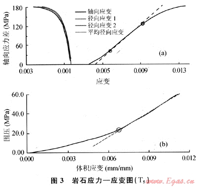 3是采用三軸巖石力學測試系統(tǒng)得到的巖石應力-應變關系曲線。從圖3-a可以看出:在應力增大的初始階段,巖石發(fā)生的變形較大,有一定軟塑性變形,隨著軸向應力增大(超過30MPa),逐漸過渡到穩(wěn)定的彈性變形階段,超過彈性極限后,巖石進入塑性變形階段,最終破壞失穩(wěn)。從圖3-b則可以更明顯地看出巖石在圍壓增大的初始階段變形較大,整個變形過程不是線彈性變形過程。