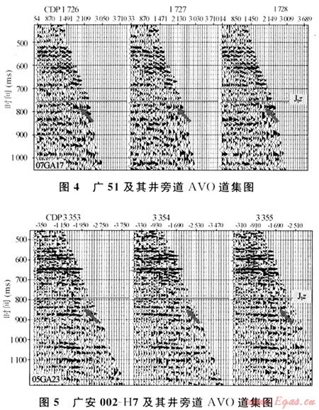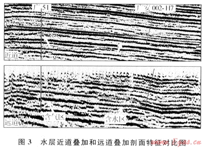 圖3是過廣51(工業(yè)氣井)和廣安002-H7(水井)的一條近道和遠(yuǎn)道疊加剖面對比圖,從圖中看出,須六段氣層底的反射在遠(yuǎn)道疊加剖面上的振幅明顯比近道疊加剖面振幅強(qiáng),近道疊加剖面主要表現(xiàn)為中-中弱振幅、較連續(xù),而遠(yuǎn)道振幅較強(qiáng),但橫向上振幅強(qiáng)弱變化明顯,有時呈低頻、復(fù)波特征;反射軸時常出現(xiàn)上下起伏、零亂等反射特征。水層在近道疊加剖面和遠(yuǎn)道疊加剖面上反射振幅都較強(qiáng),同相軸較光滑,呈高頻、連續(xù)特征,遠(yuǎn)道疊加剖面的反射振幅比近道略有增強(qiáng),但與氣層相比,不明顯。