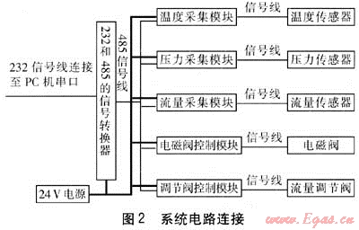 電路設(shè)計(jì)要根據(jù)測(cè)試系統(tǒng)中所選用的儀器儀表來(lái)進(jìn)行。溫度測(cè)量采用德國(guó)原產(chǎn)溫度傳感器與變送器,Pt100精度等級(jí)1/3B,4線制;溫度測(cè)量范圍為0~150℃,具有響應(yīng)時(shí)間短、測(cè)量精度高等特點(diǎn),輸出信號(hào)4~20mA。流量測(cè)量采用德國(guó)原產(chǎn)ProcessMaster系列電磁流量計(jì)、五點(diǎn)標(biāo)定后精度為0.2%。電磁流量計(jì)根據(jù)法拉第電磁感應(yīng)定律設(shè)計(jì),流量正比于介質(zhì)流速和磁通密度,以及電極間的距離。電壓信號(hào)用變送器轉(zhuǎn)換成標(biāo)準(zhǔn)信號(hào),方便數(shù)據(jù)采集,而且電磁流量計(jì)無(wú)節(jié)流部件,壓力損失小,減少能耗,只與被測(cè)流體的平均速度有關(guān),測(cè)量范圍寬。只需經(jīng)水標(biāo)定后即可測(cè)量其他介質(zhì),無(wú)須修正,相比于浮子流量計(jì)精度大大提高。壓力測(cè)量采用德國(guó)原產(chǎn)壓力傳感器,測(cè)壓范圍為0~3MPa,精度為0.15%,輸出標(biāo)準(zhǔn)電流信號(hào)。燃?xì)庀牧繙y(cè)量采用日本品川濕式氣體流量計(jì),既可以通過(guò)流量計(jì)的機(jī)械表盤讀取燃?xì)庀牧?,也可以通過(guò)其發(fā)出的電信號(hào)經(jīng)過(guò)處理后得到燃?xì)庀牧?。燃?xì)鈮毫y(cè)量用壓力表量程為0~5kPa,輸出相應(yīng)的電信號(hào)進(jìn)行數(shù)據(jù)采集。流量調(diào)節(jié)閥選用電動(dòng)調(diào)節(jié)閥,進(jìn)行遠(yuǎn)程控制。煙氣分析儀采用多組分煙氣分析儀,各組分都有對(duì)應(yīng)的電信號(hào)輸出。數(shù)據(jù)采集模塊選用ADAM系列模塊對(duì)各參數(shù)進(jìn)行高精度采集與控制。系統(tǒng)電路連接見圖2。