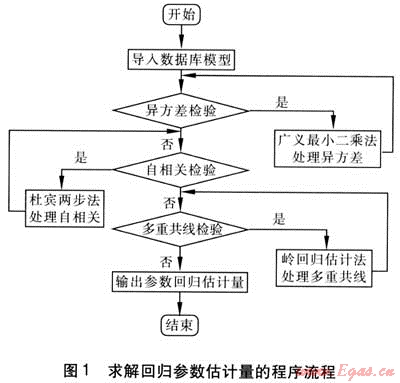 根據(jù)橫截面數(shù)據(jù)樣本,采用最小二乘法對式(9)進(jìn)行參數(shù)估計,得到滿足經(jīng)典回歸假設(shè)檢驗的回歸參數(shù)。求解回歸參數(shù)估計量程序流程見圖1。