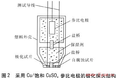 下面以Cu/飽和CuSO4參比電極探頭結(jié)構(gòu)為例進(jìn)行說(shuō)明,探頭結(jié)構(gòu)見圖2。該極化探頭分為上、下兩個(gè)腔室,上腔室為參比電極安裝室,下腔室安裝有極化試片、自腐蝕試片、保濕劑,上腔室與下腔室、下腔室與極化試片通過(guò)導(dǎo)電鹽橋連接[3]。極化探頭有3根導(dǎo)線分別與參比電極、極化試片、自腐蝕試片相連接。極化試片的連接導(dǎo)線既用作試片的極化線又兼作電位的測(cè)量線。