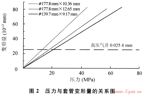 根據(jù)式(6)可以得出常用不同尺寸和不同壁厚油層套管在變形為0.02mm微間隙所需的最小應變力(壓差值,圖2)。