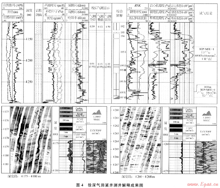利用上述方法編制常規(guī)測井資料識別裂縫發(fā)育程度評價程序和裂縫參數計算程序,并對研究區(qū)若干井進行了計算,圖4是其中一口井的處理解釋結果:195Ⅰ層TCP+MFE-Ⅰ測試,日產氣105876m3,該層地層因數比值為15.6,裂縫角度指示參數為1.9,顯示該層高角度裂縫較發(fā)育,裂縫張開度1150.5μm,裂縫孔隙度0.11%,裂縫滲透率310.9×10-3μm2,FMI圖像顯示195Ⅰ層垂直縫和高角度縫發(fā)育,核磁測井T2分布譜顯示為30ms以上的大孔隙,表明本層裂縫提供了極好的流體滲流通道,使得儲層在自然測試時能達到高產。下部195Ⅴ、195Ⅵ兩層地層因數比值29.9,裂縫角度指示參數0.5,顯示該段地層發(fā)育40°~70°的傾斜裂縫,測井計算的裂縫張開度為9.8μm,裂縫孔隙度0.02%,裂縫滲透率0.002×10-3μm2,表明該段地層裂縫雖然發(fā)育,但為無效縫或裂縫的徑向延伸較淺,沒有起到溝通流體滲流通道的作用,對產能沒有貢獻。FMI圖像顯示195Ⅴ、195Ⅵ兩層存在誘導縫特征,徑向延伸短,裂縫開度小,是無效縫。核磁測井T2分布譜顯示小于30ms的束縛水孔隙,地層裂縫被低阻泥質充填。該段地層經TCP+MFE-Ⅰ測試,日產氣106m3。
