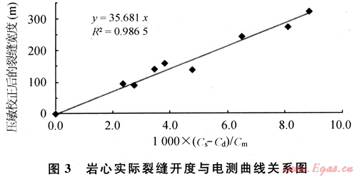 巖心實際裂縫開度(經壓敏校正)與電測值關系(圖3)表明:A=3.5×104,比理論值高,說明工區(qū)低角度縫很少。當出現低角度縫且Cs<Cd時,公式中的(Cs-Cd)換成(Cd-Cb),其中,Cb為基巖塊電導率,從與解釋層鄰近的非裂縫性地層讀取,裂縫愈發(fā)育,側向測井比基質電阻率降得愈低。