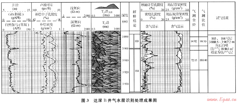 圖3是達深B井流體識別處理成果圖,巖性為玄武巖。從圖中可以看到,試氣層段應用核磁共振判別法的密度孔隙度與核磁計算孔隙度有明顯幅度差,應用雙密度重疊法也見明顯含氣反映,且錄井氣測比值較大,綜合分析判別該層為氣層。實際試氣結(jié)果表明,3888.0~3907.0m井段壓后日產(chǎn)氣18851m3,與測井識別結(jié)果一致。