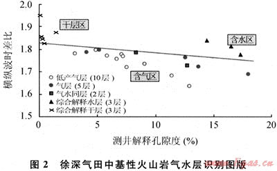 理論上當?shù)貙雍瑲鈺r,由于天然氣比液體更容易壓縮,因此含氣巖石的縱波速度一般比含液體巖石的速度低,即縱波時差(△Tc)在氣層處變大;而橫波時差(△Ts)卻變化極小。同時由于地層巖性、物性的變化同樣也可能引起速度的改變,因此單純應用縱波時差去識別天然氣,存在著一定的風險性,但如果通過比較橫波和縱波的速度差異來判別氣層,則要可靠得多。故可據(jù)此來進行流體識別。