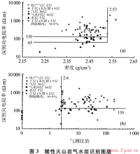 在儲層“四性”關(guān)系研究的基礎(chǔ)上,通過敏感性分析,確定了最能反映儲層流體性質(zhì)特征的參數(shù)電阻率、密度和氣測比值,建立了酸性火山巖氣水層解釋圖版(圖3),圖版精度都超過90.0%,達(dá)到了儲量規(guī)范的要求。