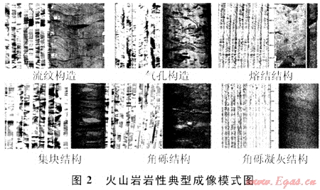 徐深氣田火山巖巖性成因復(fù)雜,即使巖石化學(xué)成分相同,但如果結(jié)構(gòu)、構(gòu)造不同,其巖石類型也會不同。而應(yīng)用交會圖版法雖然可以識別成分不同的巖性(如酸性巖、中性巖和基性巖等),但對于成分相同、而結(jié)構(gòu)或構(gòu)造不同的巖性如流紋質(zhì)熔結(jié)凝灰?guī)r、角礫凝灰?guī)r、火山集塊巖、火山角礫巖這些火山巖巖性識別效果較差,對這類巖性必須結(jié)合成像測井進(jìn)行識別。圖2為火山巖典型成像模式圖。