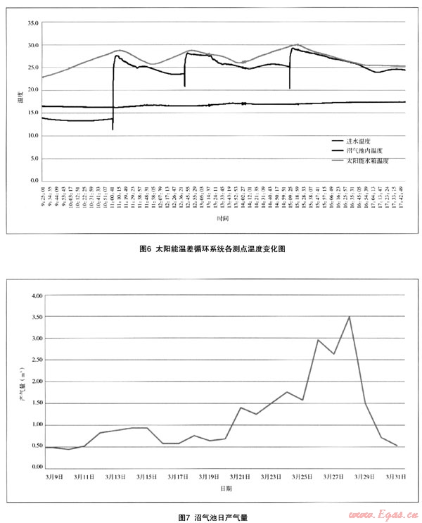 由圖5可得:自2月13日系統(tǒng)安裝調(diào)試完畢后,在太陽能熱水循環(huán)作用下,3月初沼氣池內(nèi)溫度已經(jīng)升高并保持在17℃左右;3月份石家莊地區(qū)日均氣溫在10%左右,太陽能水箱溫度基本維持在30%以上;沼氣池通過保溫層及太陽能水循環(huán)作用下基本高于日均氣溫10℃左右;整個(gè)3月份沼氣池溫度升高并維持在20%左右,月底基本達(dá)到了25℃。