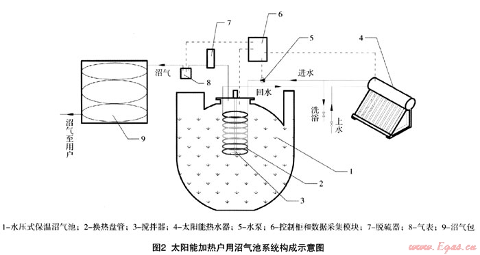 本文提出了一種以太陽能輔助加熱戶用沼氣池的沼氣池加熱保溫方法,即將已有的太陽能熱水器和沼氣池集成一種新的裝置,通過控制系統(tǒng)將兩者有機(jī)的結(jié)合在一起,對(duì)冬季沼氣池內(nèi)沼液進(jìn)行加熱,從而提高沼液溫度,提高產(chǎn)氣量,使冬季沼氣池產(chǎn)氣也能滿足一般農(nóng)戶的家庭日常生活需求,實(shí)現(xiàn)沼氣池全年供氣。
