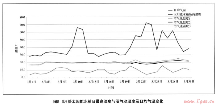 4.2.1 3月份太陽能水箱日最高溫度與沼氣池溫度及日均氣溫變化如圖5所示