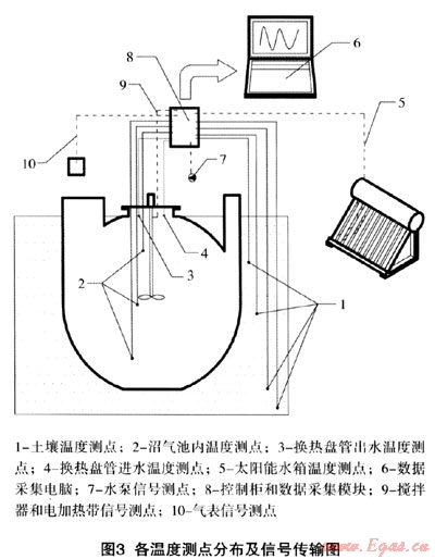 針對(duì)這一問題,本文設(shè)計(jì)了一種太陽輔助加熱戶用沼氣池系統(tǒng)。在沼氣池內(nèi)設(shè)置換熱盤管和攪拌裝置。夏季,沼氣池與太陽能分開工作;冬季,利用太陽熱水器的低溫?zé)崴g接加熱沼氣池。通過現(xiàn)場(chǎng)測(cè)試獲取的運(yùn)行數(shù)據(jù),對(duì)該系統(tǒng)的實(shí)用性進(jìn)行了分析。初步結(jié)果表明,沼氣池的保溫與太陽輔助加熱可實(shí)現(xiàn)太陽能與沼氣的互補(bǔ),充分發(fā)揮二者優(yōu)勢(shì),具有良好的實(shí)用性。