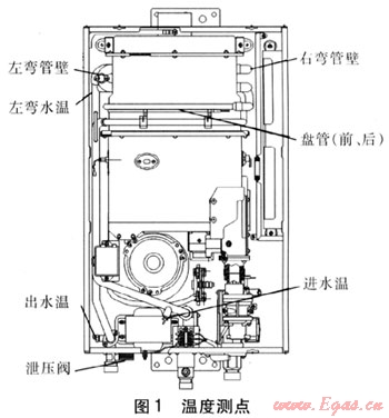 圖1為溫度測點,此外,還有室外溫度和熱水器周圍溫度(廚房、冷陽臺),其中左彎水溫、進水溫、出水溫采用在水管上鉆孔將溫度探頭伸進管中測水溫形式,其余各點則測水管外壁。