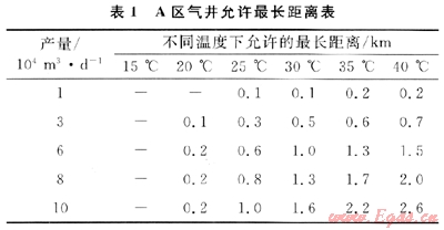 1) A區(qū)氣井的天然氣不伴熱直接進(jìn)站,不加熱直接脫水,可以取消采氣管道伴熱和站內(nèi)加熱工藝。不同產(chǎn)氣量和井口溫度允許采氣管道距離不同,其允許最長距離見表1。