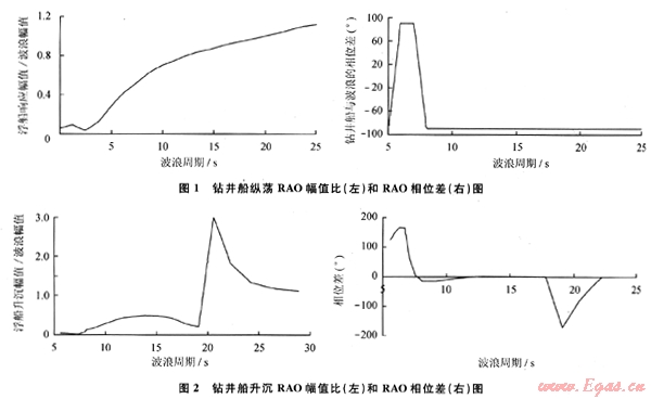 鉆井船的響應(yīng)幅值算子(Response Amplitude Operator,簡稱RAO)可以用來模擬鉆井船對特定波的響應(yīng)。響應(yīng)幅值算子包括幅值傳遞函數(shù)與相位傳遞函數(shù)。前者確定了不同波浪周期時,鉆井船響應(yīng)與對應(yīng)組成波的幅值比;后者確定了不同波浪周期時,鉆井船響應(yīng)與對應(yīng)組成波的相位差。圖1中是鉆井船縱蕩RAO幅值比和相位差。