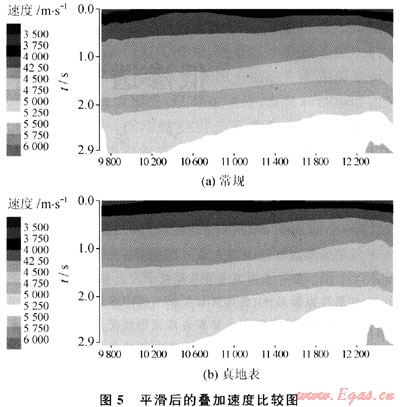 目前的疊加速度將受近地表淺層低速帶的影響。對(duì)習(xí)慣于用疊加速度作偏移,甚至用疊加速度作時(shí)一深轉(zhuǎn)換的做法可能認(rèn)為不妥,只需將速度作個(gè)基準(zhǔn)面校正或以一定長(zhǎng)度的平滑濾波,去掉高頻成分,還是可以應(yīng)用的(圖5)。但這都是在一般比較平緩構(gòu)造下的情況,在高陡復(fù)雜構(gòu)造情況下,還是要先作DM0,經(jīng)DM0后所掃速度才能為偏移和時(shí)深轉(zhuǎn)換提供比較合理的速度。從圖5-b可看出,淺層層次感更清楚、橫向更穩(wěn)定。