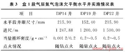 2009年先后針對(duì)大牛地氣田的盒1段氣層在DP14井、DP19井和DP22井開(kāi)展了氮?dú)馀菽菲胶忏@水平井的現(xiàn)場(chǎng)試驗(yàn),在儲(chǔ)層保護(hù)、油氣發(fā)現(xiàn)、自然建產(chǎn)和提高鉆井速度方面取得了顯著效果,表3給出了盒1段氣層氮?dú)馀菽菲胶馑骄畬?shí)施情況。