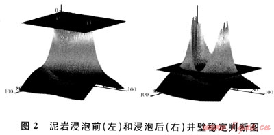 圖2給出了盒1段氣層泥巖浸泡前(左)和浸泡后(右)井壁穩(wěn)定判斷圖。從圖2中可以明顯看出:鉆井液浸泡前井壁穩(wěn)定,只有局部有輕微剝落掉塊;鉆井液浸泡后井壁穩(wěn)定性下降,井壁開(kāi)始出現(xiàn)大范圍垮塌失穩(wěn)。因此,泡沫鉆井液鉆遇泥巖或泥質(zhì)條帶存在失穩(wěn)風(fēng)險(xiǎn)。