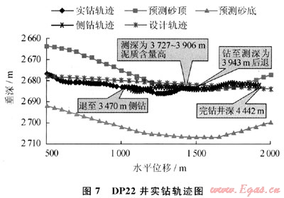 DP22井在水平段的氮?dú)馀菽菲胶忏@進(jìn)過(guò)程當(dāng)中實(shí)現(xiàn)了隨鉆點(diǎn)火,火焰高4~6m,后效火焰高9~11m,油氣顯示非?;钴S。DP22井在井深3727~3906m井段伽馬值偏高,判斷為鉆遇泥巖夾層,后退至3470m處進(jìn)行懸空下切側(cè)鉆,后鉆至井深4442m處完鉆,由于后退下切側(cè)鉆導(dǎo)致氮?dú)馀菽瓕?shí)鉆進(jìn)尺超過(guò)1900m。在最后一趟鉆起鉆過(guò)程中出現(xiàn)了卡鉆事故。事故原因?yàn)槌辽晨ㄣ@,最后一趟鉆總進(jìn)尺為281.54m,平均機(jī)械鉆速為11.04m/h,在鉆井過(guò)程中伽馬值偏高,同時(shí)出口處沒(méi)有巖屑返出。圖7給出了DP22井氮?dú)馀菽菲胶馑蕉螌?shí)鉆軌跡。