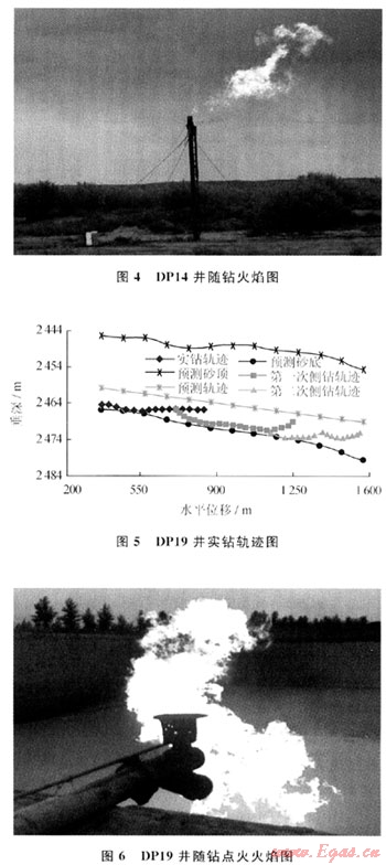 DP19井采用氮?dú)馀菽菲胶忏@水平井技術(shù),實(shí)現(xiàn)了隨鉆點(diǎn)火,火焰高達(dá)3~5m。在欠平衡水平段的鉆井過(guò)程中由于兩次鉆遇大段泥巖,進(jìn)行了兩次后退懸空下切側(cè)鉆繞泥,導(dǎo)致氮?dú)馀菽菲胶鈱?shí)鉆進(jìn)尺超過(guò)1500m,在整個(gè)欠平衡水平段鉆井過(guò)程中沒(méi)有出現(xiàn)井壁失穩(wěn)。圖5給出了DP19井氮?dú)馀菽菲胶馑蕉螌?shí)鉆軌跡,圖6給出了DP19井隨鉆點(diǎn)火情況。