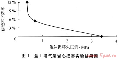 圖1給出了盒1段氣層巖心損害實(shí)驗(yàn)結(jié)果,從圖1中可以確定出盒1段氣層欠平衡水平井的最佳欠壓值為3.4MPa,即在盒1段氣層實(shí)施欠平衡水平井的循環(huán)介質(zhì)當(dāng)量循環(huán)密度需小于0.76g/cm3,滿足該條件的循環(huán)介質(zhì)只有氮?dú)夂偷獨(dú)馀菽?,但考慮到鉆井時(shí)產(chǎn)生的振動(dòng)影響、電磁隨鉆測(cè)量系統(tǒng)的可靠性要求以及鉆頭的冷卻問(wèn)題,決定選用可循環(huán)氮?dú)馀菽鳛檠h(huán)介質(zhì),其當(dāng)量循環(huán)密度為0.2~0.5g/cm3,滿足了施工要求。