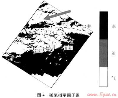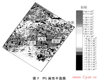 對比反演結(jié)果圖,發(fā)現(xiàn)圖4指示的含氣范圍(黃色區(qū)域)、氣水界面以及與各井含油氣性與實鉆結(jié)果吻合。需要強調(diào)的是:該技術(shù)對B井的預(yù)測與實鉆結(jié)果吻合,更接近地質(zhì)認(rèn)識。但是PY地區(qū)F井北部有一處面積達20km2的高含氣區(qū)(箭頭所示),需要進一步評價、落實該地區(qū)的含油氣性。