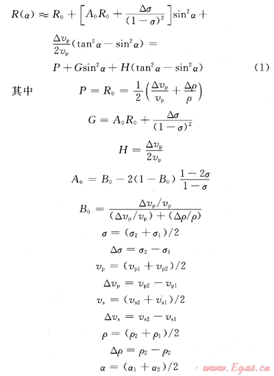 Zoeppritz理論是AV0技術(shù)的核心,完整的Zoeppritz方程[2]全面考慮了平面縱波和橫波入射在平界面兩側(cè)產(chǎn)生的縱橫波反射和透射能量之間的關(guān)系。當(dāng)反射波地震勘探使用主要產(chǎn)生縱波的震源、接收的是反射縱波時,Zoeppritz公式可以被大大簡化,即只考慮平面縱波入射產(chǎn)生的反射振幅隨入射角的變化情況。一方面可以節(jié)省計算工作量,另一方面更有利于AV0技術(shù)的研究和應(yīng)用。R.T.Shuey給出的簡化公式是目前人們使用最多的Zoeppritz近似方程[3]:
