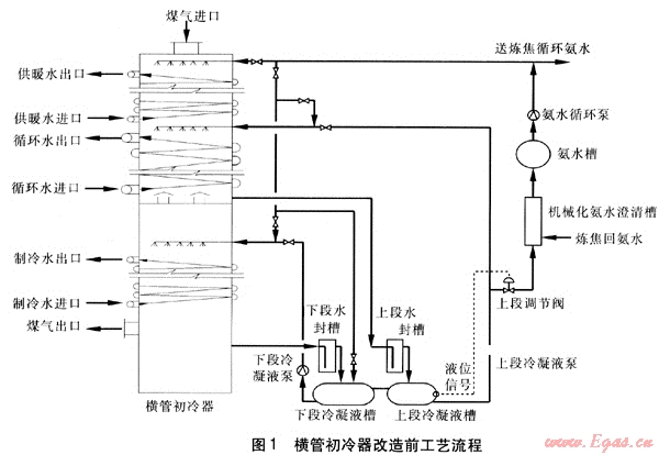 5臺(tái)橫管初冷器并聯(lián)操作,煤氣從橫管初冷器上部進(jìn)入,為了保證初冷器對煤氣的冷卻效果,用水對煤氣分3段進(jìn)行冷卻。上段冬季進(jìn)水水溫為47℃,出水水溫為60℃,為合理利用熱量,將出水為附近居民供暖,回水再去上段冷卻煤氣,故該廠稱此水為供暖水。其余時(shí)間上段同中段一樣,用進(jìn)水水溫為32℃、出水水溫為45℃的循環(huán)水對煤氣進(jìn)行冷卻。下段用16℃制冷水將煤氣冷卻至18~22℃。為保證初冷器的冷卻除萘效果,在中、下段頂部連續(xù)噴灑焦油、氨水混合液,在上段頂部用熱氨水循環(huán)噴灑,以清除管壁上的焦油、萘等雜質(zhì)。初冷器上、中段排出的冷凝液經(jīng)水封槽流入上段冷凝液槽,用泵將其送入初冷器中段頂部循環(huán)噴灑,下段冷凝液槽內(nèi)多余的部分送到機(jī)械化氨水澄清槽。初冷器下段排出的冷凝液經(jīng)水封槽流入下段冷凝液槽,用泵將其送入初冷器下段頂部循環(huán)噴灑,下段冷凝液槽內(nèi)多余部分流入上段冷凝液槽。橫管初冷器改造前工藝流程見圖1。