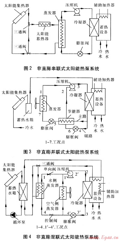 并聯(lián)式:在非直膨并聯(lián)式太陽能熱泵系統(tǒng)中,太陽能熱水系統(tǒng)與熱泵系統(tǒng)獨立工作,互為補(bǔ)充。當(dāng)太陽能輻射不足時,熱泵系統(tǒng)運行,或兩者一起運行。