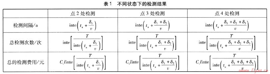 在運行過程中,因為缺陷的產(chǎn)生是隨機過程,所以很難把握圖中點l的狀態(tài),即防腐層一旦失效便進行檢測修復,所以從點2狀態(tài)開始分析,各狀態(tài)的分析結果見表1,表中T(單位為a)為管道的使用壽命,l(單位為km)為所計算管段的長度。由于檢測間隔和檢測次數(shù)為整數(shù),定義函數(shù)inte[f(x)]為f(x)值的整數(shù)部分,若計算所得檢測次數(shù)為整數(shù),按實際運行壽命中檢測發(fā)生的次數(shù),最后一次檢測(即管道運行時間已到使用壽命時進行的檢測)不考慮進檢測維修規(guī)劃中,則實際發(fā)生的檢測次數(shù)應為計算值減去1,在以下的計算中檢測間隔和檢測次數(shù)都按照這個方法進行計算。