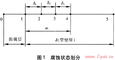 沿壁厚方向將缺陷的發(fā)展劃分成4個階段,見圖1。在模型的實際應用過程中,可根據(jù)實際供選擇的維修方式進行腐蝕階段和維修種類的劃分。用△δ表示缺陷的腐蝕深度,在圖1中的點4處,腐蝕深度達到最大,即δ123=m。